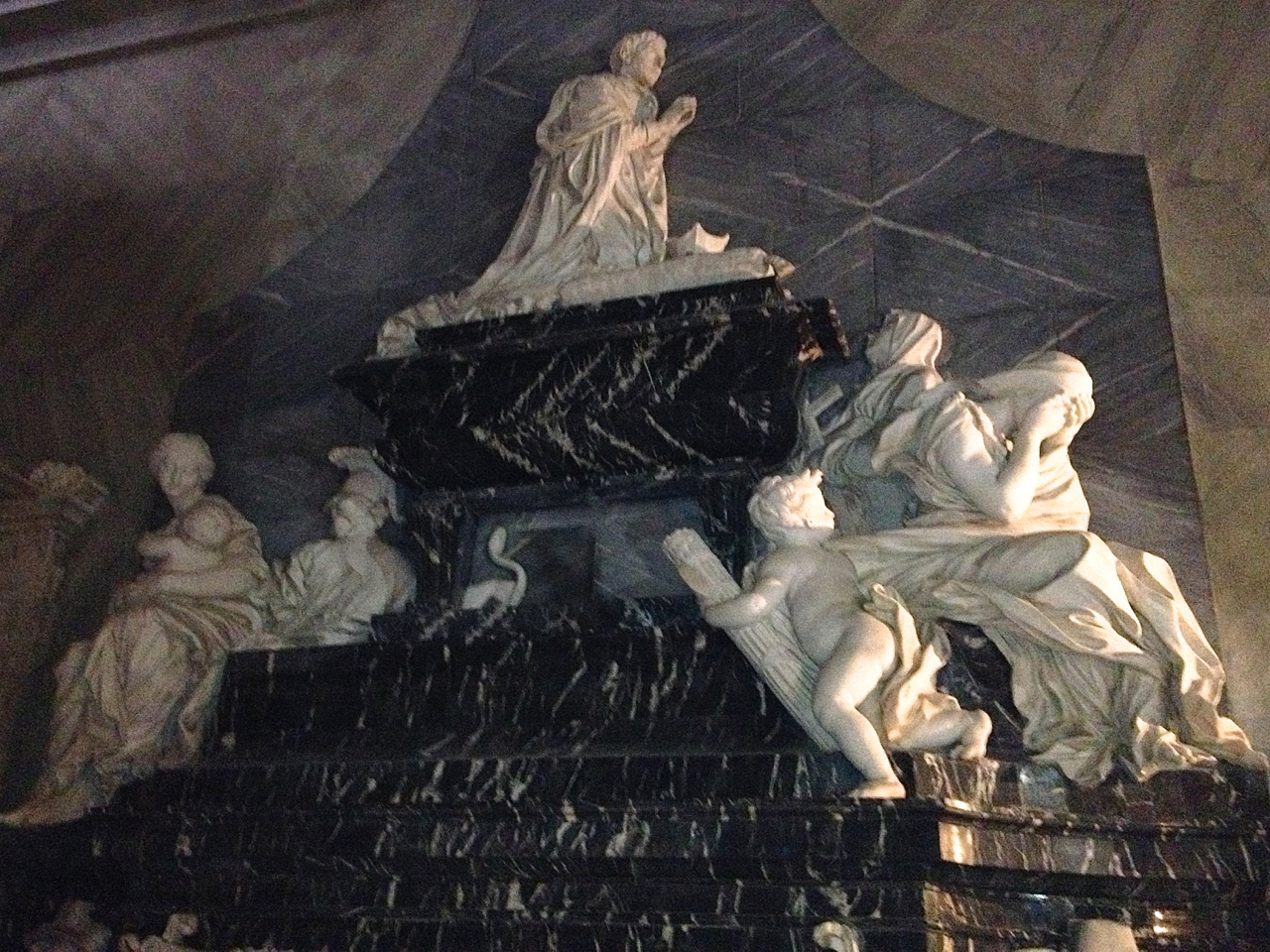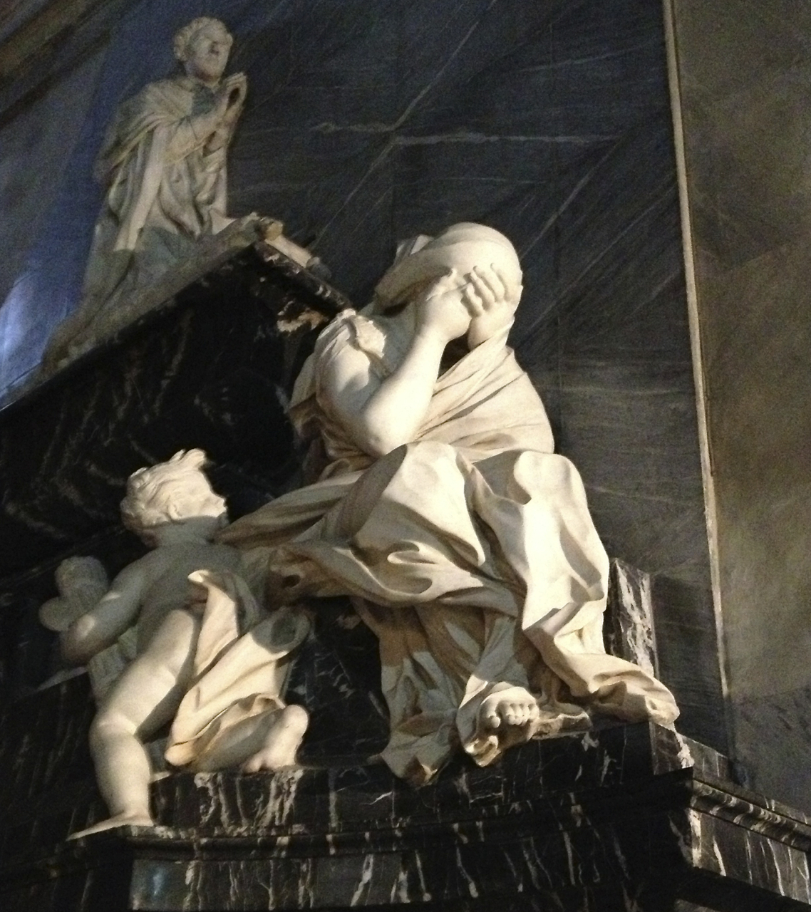 No scandalous love life for the cardinal that I could find, so the sarcophagus is adorned with four allegorical figures: Charity, Justice, Knowledge and Faith, with the deceased Cardinal kneeling on top. But just look at the figure on the right (I think that’s Knowledge), sobbing with her hands over her face.